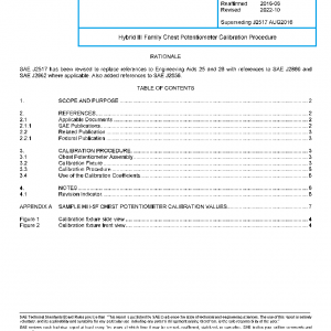The intent of this recommended practice is to minimize the variations in chest deflection measurements between crash testing laboratories. Before this procedure was written, a round robin showed variations for the Small Female of 10% among eight labs for the chest pot sensitivity value. A follow-up round robin of this procedure showed a worst case variation of 2.7% among 10 labs, with a standard deviation of 0.9%. The initial version of SAE J2517 released in May 2000 attempted to fix this problem by recommending a two-point calibration which was not intended to correct for the nonlinearity (which, for example, is as large as 3% for the Small Female but is small near the peak). It also did not require the measurement of a starting position of the potentiometer before each crash test, thus it did not correct for the difference in starting chest geometry between a subject dummy and its design intent. It was intended to be a simple and reproducible calibration procedure which crash test facilities could easily adopt with little or no modifications to their facilities. In practice, most laboratories did not adopt the procedure since it did not correct for the nonlinearities.