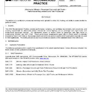 This SAE Recommended Practice provides performance, sampling, and certifying requirements, test procedures, and marking requirements for aftermarket wheels intended for normal highway use on passenger cars, light trucks, and multipurpose passenger vehicles. For aftermarket wheels on trailers drawn by passenger cars, light trucks or multipurpose vehicles, see SAE J1204. These performance requirements apply only to wheels made of materials included in Table 1 and Table 2. New nomenclature and terms are added to clarify wheel constructions typically not used in OEM applications. The testing procedures and requirements are based on SAE standards listed in the references.