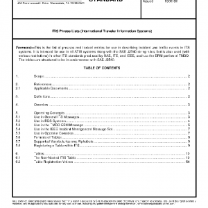 This SAE Standard provides a table of textual messages meeting the requirements for expressing “International Traveler Information Systems” (ITIS) phrases commonly used in the ITS industry. The tables provided herein follow the rules of SAE J2540 and therefore allow a local representation in various different languages, media expressions etc., to allow true international use of these phrases. The phrases are predominantly intended for use in the description of traffic related events of interest to travelers and other traffic practitioners. Other phrases exit for other specific specialty areas of ITS, and all such phrases follow a set of encoding and decoding rules outlined in SAE J2540 to ensure that the use of these phrases in messages remain interoperable between disparate types of user equipment.