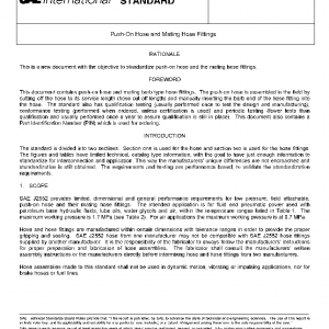 SAE J2552 provides limited, dimensional and general performance requirements for low pressure, field attachable, push-on hose and their mating hose fittings. The intended application is for fluid and pneumatic power used with petroleum base hydraulic fluids, lube oils, water glycols and air, within the temperature ranges listed in Table 1. The maximum working pressure is 1.7 MPa (see Table 2). For air applications the maximum working pressure is at 0.7 MPa.
