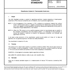 This SAE Standard provides a system for specifying significant material properties of thermoplastic elastomers (TPEs) that are intended for, but not limited to, use in automotive applications.