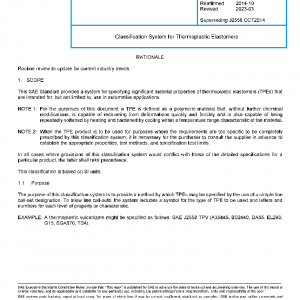 This SAE Standard provides a system for specifying significant material properties of thermoplastic elastomers (TPEs) that are intended for, but not limited to, use in automotive applications.