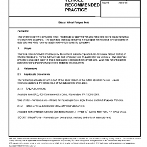 This SAE Recommended Practice provides uniform laboratory procedures for biaxial fatigue testing of wheels intended for normal highway use and temporary use on passenger car vehicles. The appendix provides a scaleable load file that is applicable to ballasted passenger cars. Load files for unballasted passenger cars and light trucks will be added to this document.