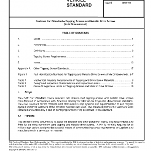 This SAE Part Standard covers selected inch dimensioned tapping screws and metallic drive screws manufactured in accordance with American Society for Mechanical Engineers dimensional standards. This SAE standard covers material most often used in ship systems and equipment but its use may be applied wherever fasteners of the covered materials are used. This standard permits the fasteners to be identified and ordered by a part or identifying number (PIN) as defined in this standard.