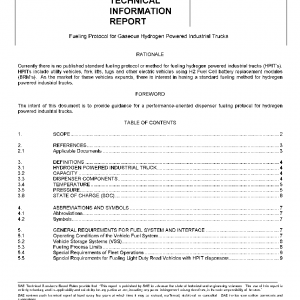 This document establishes safety limits and performance requirements for gaseous hydrogen fuel dispensers used to fuel Hydrogen Powered Industrial Trucks (HPITs). It also describes several example fueling methods for gaseous hydrogen dispensers serving HPIT vehicles.