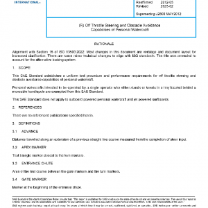 This SAE Standard establishes a uniform test procedure and performance requirements for off throttle steering and obstacle avoidance capabilities of personal watercraft.