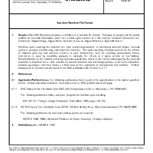 This SAE Standard provides a definition of a rainflow file format. This type of simple text file would contain all relevant information about the rainflow cycle content of a time history. Included information are Comments, Signal Range, Signal Mean, Number of Cycles, Signal Maximum, Signal Minimum.
