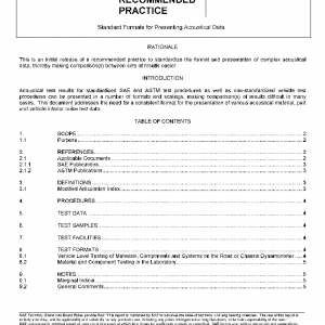 SAE developed this document and associated spreadsheets at the request of automobile manufacturers to help compare products from multiple suppliers using standard data presentation formats. This document includes several preferred formats for presenting acoustical data on materials, components, systems, or vehicles. These formats cover the range of acoustical tests commonly conducted in the automotive industry. These tests follow SAE and ASTM test practices as well as vehicle specific test methods.