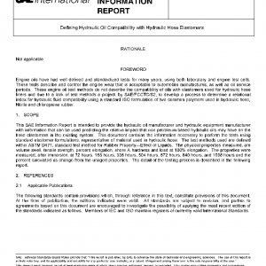 This SAE Information Report is intended to provide the hydraulic oil manufacturer and hydraulic equipment manufacturer with information that can be used predicting the relative impact that non petroleum based hydraulic oils may have on the hose elastomers in the existing system. This document contains the information necessary to perform the tests using standard elastomer formulations, representative of material used in hydraulic hose. The test methods used are defined within ASTM D471, standard test method for Rubber Property—Effect of Liquids. The physical properties measured, are volume swell, tensile strength, percent elongation, shore A hardness and load at 100% elongation. The properties were measured, after immersion, at 72 hours, 168 hours, 336 hours, 504 hours, 672 hours, 840 hours, and 1008 hours and the percent calculated as change from the unaged properties. The detail of the testing process is described in the following report.