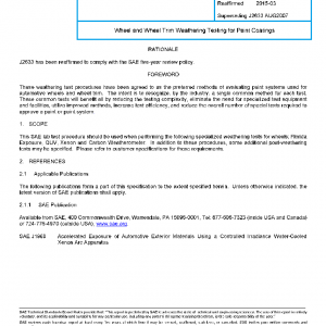 This SAE lab test procedure should be used when performing the following specialized weathering tests for wheels; Florida Exposure, QUV, Xenon and Carbon Weatherometer. In addition to these procedures, some additional post-weathering tests may be specified. Please refer to customer specifications for these requirements.