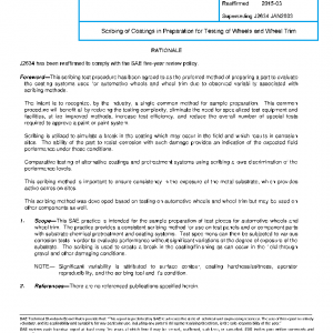 This SAE practice is intended for the sample preparation of test pieces for automotive wheels and wheel trim. The practice provides a consistent scribing method for use on test panels and or component parts with substrate chemical pretreatment and coating systems. Test specimens can then be subjected to various corrosion tests in order to evaluate performance without significant variations of the degree of exposure of the substrate. The scribing is used to create a break in the coating/finishing as can occur in the field through gravel and other damaging conditions.