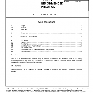 This SAE lab recommended practice may be applied to corrosion test methods such as salt spray, filiform, Corrosion creep back, etc. This procedure is intended to permit corrosion testing to be assessed between Laboratories for correlation purposes.
