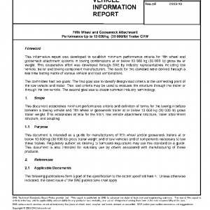 This document establishes minimum performance criteria and definition of terms for the towing interface between a towing vehicle and fifth wheel or gooseneck trailer at or below 13 608 kg (30 000 lb) gross trailer weight. This establishes criteria for the hitch, tow vehicle attachment structure, trailer attachment structure, and coupling.
