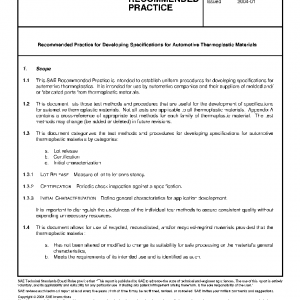 This SAE Recommended Practice is intended to establish uniform procedures for developing specifications for automotive thermoplastics. It is intended for use by automotive companies and their suppliers of molded and/ or fabricated parts from thermoplastic materials.