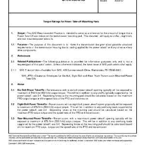 This SAE Recommended Practice is intended to serve as a reference for the amount of torque that a Power Take-Off can induce on the transmission mounting pad. This document will apply to six-bolt, eight-bolt, and rear mounted power take-offs.