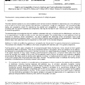 This SAE standard applies to any and all additives and chemical solutions intended for aftermarket use in the refrigerant circuit of vehicle air-conditioning systems with belt-driven compressors, except as noted below. This standard provides testing and acceptance criteria for determining the stability and compatibility of additives and flushing materials (solutions) with A/C system materials and components, that may be intended for use in servicing or operation of vehicle air conditioning systems.