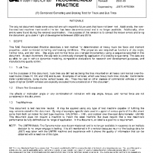 This SAE Recommended Practice describes a test method for determination of heavy truck tire force and moment properties under combined cornering and braking conditions. The properties are acquired as functions of slip angle, normal force, and slip ratio. Slip angle and normal force are changed incrementally using a sequence specified in this document. At each increment, the slip ratio is continually changed by application of a braking torque ramp. The data are suitable for use in vehicle dynamics modeling, comparative evaluations for research and development purposes, and manufacturing quality control.