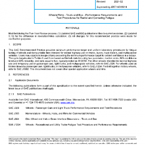 This SAE Recommended Practice provides minimum performance target and uniform laboratory procedures for fatigue testing of wheels and demountable rims intended for normal highway use on trucks, buses, truck-trailers, and multipurpose vehicles. Users may establish design criteria exceeding the minimum performance target for added confidence in a design. The cycle target noted in Tables 1 and 2 are based on Weibull statistics using two parameter, median ranks, 50% confidence level and 90% reliability, and beta equal to two, typically noted as B10C50. For other wheels intended for normal highway use and temporary use on passenger cars, light trucks, and multipurpose vehicles, refer to SAE J328. For wheels used on trailers drawn by passenger cars, light trucks, or multipurpose vehicles, refer to SAE J1204. For bolt together military wheels, refer to SAE J1992. This document does not cover other special application wheels and rims.