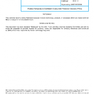 This SAE Recommended Practice defines the test conditions, procedures, and performance requirements for PTC (positive temperature coefficient of resistance) overcurrent protection devices. PTCs are typically either polymeric (PPTC) or ceramic (CPTC). It is important to note battery voltages versus powernets/system voltage versus max battery voltages: (12 V/14 V/16 V, 24 V/28 V/32 V, and 36 V/42 V/58 V). All voltages are DC. These devices are typically rated with a maximum operating voltage, which for vehicular systems need to be 16 V (for 12 V batteries), 32 V (for 24 V batteries), and 58 V (for 36 V batteries/42 V powernets). PTC devices are considered to be self-resetting after responding to overcurrent conditions and after such condition has been removed from the affected circuit containing the PTC.