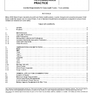 This document applies to factory and after-market installed DC-to-AC inverter systems (Including inverter chargers) providing up 3000 W of 120 VAC line-voltage power as a convenience for operator and passenger use. Such inverters are intended to power user loads not essential to vehicle Operation or safety (e.g., HVAC, TV, microwave ovens, battery chargers for mobile phones or laptop computers, audio equipment, etc.).