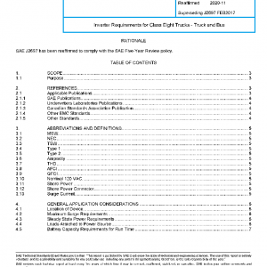 This SAE Recommended Practice is intended to describe the application of single-phase DC to AC inverters, and bidirectional inverter/chargers, which supply power to ac loads in Class heavy duty on-highway trucks (10K GVW). The document identifies appropriate operating performance requirements and adds some insight into inverter selection.