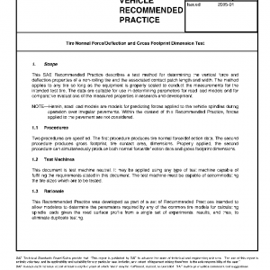 This SAE Recommended Practice describes a test method for determining the vertical force and deflection properties of a non-rolling tire and the associated contact patch length and width. The method applies to any tire so long as the equipment is properly scaled to conduct the measurements for the intended test tire. The data are suitable for use in determining parameters for road load models and for comparative evaluations of the measured properties in research and development.