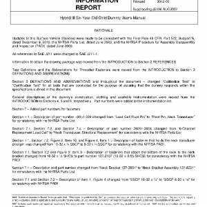 This user’s manual covers the Hybrid III 6-year-old child test dummy, including changes specified in 49 CFR Part 572, Subpart N in the final rule dated December 9, 2010. It is intended for technicians who work with this device. It covers the construction and clothing, disassembly and reassembly, available instrumentation, external dimensions and segment masses, as well as certification and inspection test procedures. Appendix A contains guidelines for safe handling of instrumented dummies. Appendix B contains instructions for repairing dummy flesh. Appendix C includes procedures for adjusting the joints throughout the dummy.