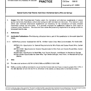 This SAE Recommended Practice covers the mechanical and chemical requirements of special quality high tensile, hard-drawn carbon-steel spring wire with restricted size tolerances. This material is used where such restricted dimensional requirements are necessary for the manufacture of highly stressed mechanical springs and wire forms. It is generally employed for applications subject to static loads or infrequent stress repetitions. This document also covers the processing requirements of springs and forms fabricated from this wire.