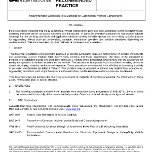 This document establishes recommended practices to validate acceptable corrosion performance of metallic components and assemblies used in medium truck, heavy truck, and bus and trailer applications. The focus of the document is methods of accelerated testing and evaluation of results. A variety of test procedures are provided that are appropriate for testing components at various locations on the vehicle. The procedures incorporate cyclic conditions including corrosive chemicals, drying, humidity, and abrasive exposure. These procedures are intended to be effective in evaluating a variety of corrosion mechanisms as listed in Table 2. Test duration may be adjusted to achieve any desired level of exposure. Aggravating conditions such as joint rotation, mechanical stress, and temperature extremes are also considered.