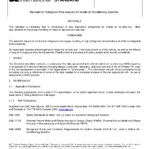 This Standard describes methods to understand the risks associated with vehicle mobile air conditioning [MAC] systems in all aspects of a vehicle’s lifecycle including design, production, assembly, operation and end of life. Information for input to the risk assessment is provided in the Appendices of this document. This information should not be considered to be complete, but only a reference of some of the data needed for a complete analysis of the risk associated with the use of refrigerants in MAC systems.