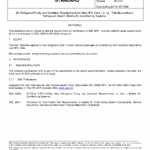 This SAE Standard applies to new refrigerant used in motor vehicle passenger air-conditioning (A/C) systems designed to use HFC-134a.