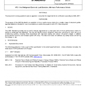 This SAE Standard provides testing and functional requirements to meet specified minimum performance criteria for electronic probe-type leak detectors. So they will identify smaller refrigerant leaks when servicing all motor vehicle air conditioning systems, including those engineered with improved sealing and smaller refrigerant charges to address environmental concerns and increase system efficiency. This document does not address any safety issues concerning their design or use.
