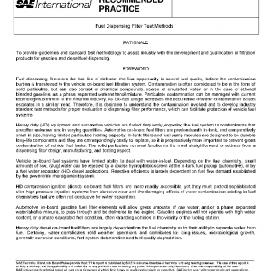 This SAE Recommended Practice is applicable to gasoline and diesel fuel filters installed on fuel dispensing equipment, mobile or stationary. It describes a set of tests used to characterize the structural integrity, filtration performance, and reaction to water contaminant with fuel dispensing filters.