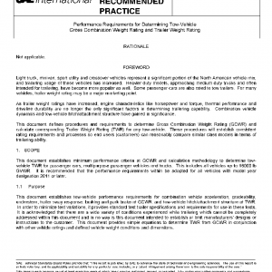 This document establishes minimum performance criteria at GCWR and calculation methodology to determine tow-vehicle TWR for passenger cars, multipurpose passenger vehicles and trucks. This includes all vehicles up to 16000 lb GVWR. It is recommended that the performance requirements within be adopted for all vehicles with model year designation 2011 or later.