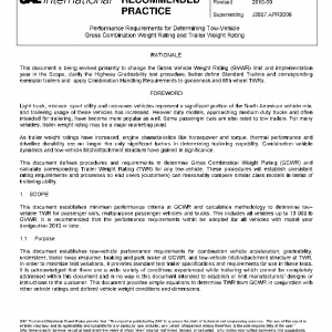 This document establishes minimum performance criteria at GCWR and calculation methodology to determine tow-vehicle TWR for passenger cars, multipurpose passenger vehicles and trucks. This includes all vehicles up to 13 000 lb GVWR. It is recommended that the performance requirements within be adopted for all vehicles with model year designation 2013 or later.