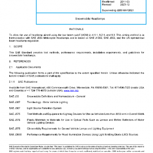 This SAE Standard provides test methods, performance requirements, installation requirements, and guidelines for snowmobile headlamps.