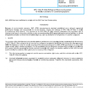 The purpose of this SAE Standard is to provide minimum performance and operating feature requirements for the recovery of HFC-134a (R-134a) refrigerant to be returned to a refrigerant reclamation facility that will process it to the appropriate AHRI 700 Standard or allow for on-site recycling of the recovered refrigerant to SAE J2788 specifications by using SAE J2788 or SAE J3030 -certified equipment. It is not acceptable that the refrigerant removed from a mobile air-conditioning (A/C) system with this equipment be directly returned to a mobile A/C system. An identifier certified to SAE J2912 is to be used to identify the contents of the system prior to recovery of the refrigerant.