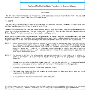 This SAE Recommended Practice describes an evaluation procedure for validating tire models for use in road load simulations and assesses the relevant dynamic behavior of tires.