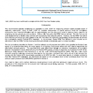 This SAE Recommended Practice establishes test procedures, test conditions, environment, and instrumentation for determining the exhaust sound pressure levels of stationary motorcycles. These are based on a comprehensive study of a wide variety of on-highway motorcycles, and therefore are intended to be applied to on-highway motorcycles. For off-highway motorcycles, SAE J1287 continues to be the recommended practice.