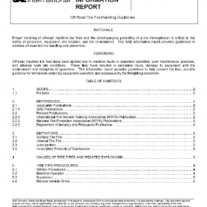 This SAE Informational report applies to tires used on off-road, rubber-tired work machines as identified in SAE J1116. This SAE document provides general guidelines for proper handling of potential and actual off-road tire fires and possible related explosions.