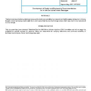 This Information Report provides recommendations for alphanumeric messages that are supplied to the vehicle by external (e.g., RDS, satellite radio) or internal (e.g., infotainment system) sources while the vehicle is in-motion. Information/design recommendations contained in this report apply to OEM (embedded) and aftermarket systems.