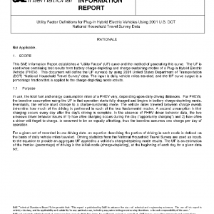 This SAE Information Report establishes a “Utility Factor” (UF) curve and the method of generating this curve. The UF is used when combining test results from battery charge-depleting and charge-sustaining modes of a Plug-in Hybrid Electric Vehicle (PHEV). This document will define the UF curve(s) by using 2001 United States Department of Transportation (DOT) “National Household Travel Survey” data. The input is daily vehicle miles traveled, and the UF curve output is a percentage fraction that is applied to the charge-depleting mode results.