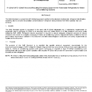 This SAE Standard applies to equipment to be used with R-1234yf refrigerant only. It establishes requirements for equipment used to recharge R-1234yf to an accuracy level that meets Section 9 of this document and purity levels defined in SAE J2099. Refrigerant service equipment is required to ensure adequate refrigerant recovery to reduce emissions and provide for accurate recharging of mobile air conditioning systems. Equipment shall be certified to meet all performance requirements outlined in this document and international/regional construction and safety requirements as outlined in this document.