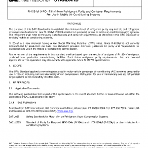 This SAE Standard applies to new refrigerant used in motor vehicle passenger air-conditioning (A/C) systems designed to use R-1234yf, including belt and electrically driven compressors. Refrigerant for use in hermetically sealed, refrigerated cargo systems is not covered by this document.
