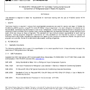 Technician training is required to ensure that recommended procedures are used for service and repair of Mobile Air Conditioning (MAC) systems using R-744 and/or R-1234yf. Unique requirements for each refrigerant are detailed within this standard. Technicians may be trained in either or both refrigerants. The technician shall be trained to recognize which refrigerant is being handled, how to handle it safely and be equipped with the essential information, proper equipment and tools, which are unique to these refrigerants. This standard outlines minimum content requirements for such training programs. Training programs designed in accordance with this standard are not intended to ensure or assess the technical skills of technicians regarding the diagnosis and repair of motor vehicle air conditioners. Rather, the goal of such programs is to provide information to technicians about safely handling refrigerants.