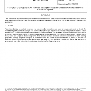 Technician training is required to ensure that recommended procedures are used for service and repair of Mobile Air Conditioning (MAC) systems using R-744 and/or R-1234yf. Unique requirements for each refrigerant are detailed within this standard. Technicians may be trained in either or both refrigerants. The technician shall be trained to recognize which refrigerant is being handled, how to handle it safely and be equipped with the essential information, proper equipment and tools, which are unique to these refrigerants. This standard outlines minimum content requirements for such training programs. Training programs designed in accordance with this standard are not intended to ensure or assess the technical skills of technicians regarding the diagnosis and repair of motor vehicle air conditioners. Rather, the goal of such programs is to provide information to technicians about safely handling refrigerants.