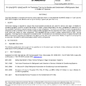 Technician training is required to ensure that recommended procedures are used for service and repair of Mobile Air Conditioning (MAC) systems using R-744 and/or R-1234yf. Unique requirements for each refrigerant are detailed within this standard. Technicians may be trained in either or both refrigerants. The technician shall be trained to recognize which refrigerant is being handled, how to handle it safely and be equipped with the essential information, proper equipment and tools, which are unique to these refrigerants. This standard outlines minimum content requirements for such training programs. Training programs designed in accordance with this standard are not intended to ensure or assess the technical skills of technicians regarding the diagnosis and repair of motor vehicle air conditioners. Rather, the goal of such programs is to provide information to technicians about safely handling refrigerants.