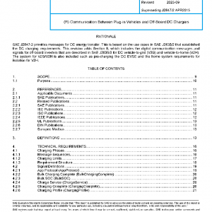 This SAE Recommended Practice establishes requirements and specifications for communication between plug-in electric vehicle (PEV) and the DC off-board charger. Where relevant, this document notes, but does not formally specify, interactions between the vehicle and vehicle operator.
