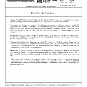 This SAE Recommended Practice provides standardized dimensions for nozzle spouts and a system for differentiating between “unleaded gasoline” nozzle spouts and all other fuel nozzle spouts.