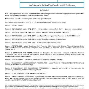 This user’s manual covers the small adult female Hybrid III test dummy. It is intended for technicians who work with this device. It covers the construction and clothing, disassembly and reassembly, available instrumentation, external dimensions and segment masses, as well as certification and inspection test procedures. It includes instructions for safe handling of the instrumented dummy, repairing dummy flesh, and adjusting the joints throughout the dummy.